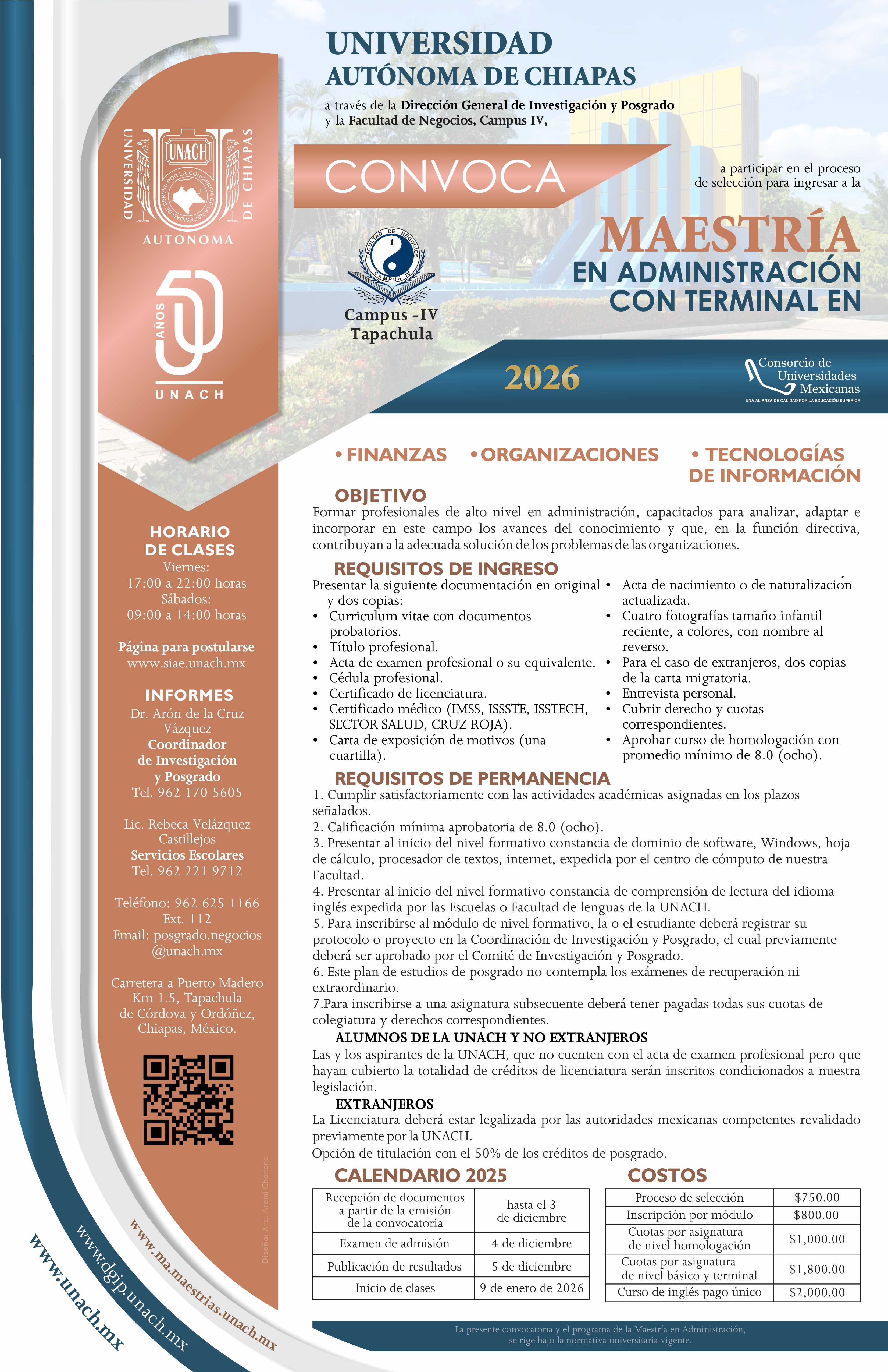 MAESTRÍA EN ADMINISTRACIÓN. RECEPCIÓN DE DOCUMENTOS HASTA EL 3 DE DICIEMBRE DE 2025 CAMPUS IV TAPACHULA